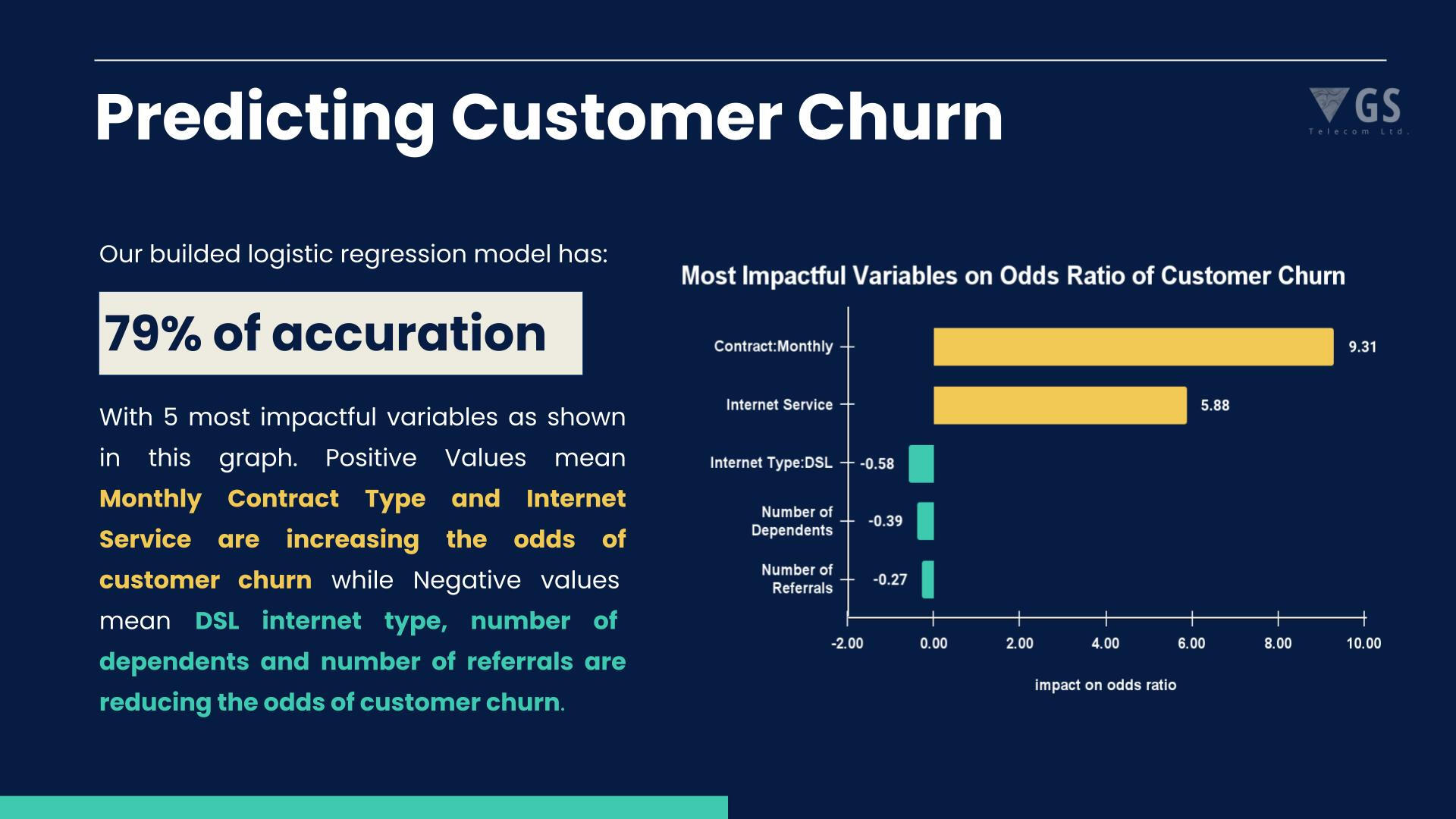 Using logistic regression we can find our customer churn modeling to predict a customer tendency to churn. Our builded logistic regression model has 79% of accuracy. We find that 5 fields that have the most impact on churn rate are contract monthly, internet service, internet type DSL, number of dependants, & number of referrals. Around 27% of our stayed customers have a churn probability rate above 50%. We need to do some prevention & improvement as listed below: