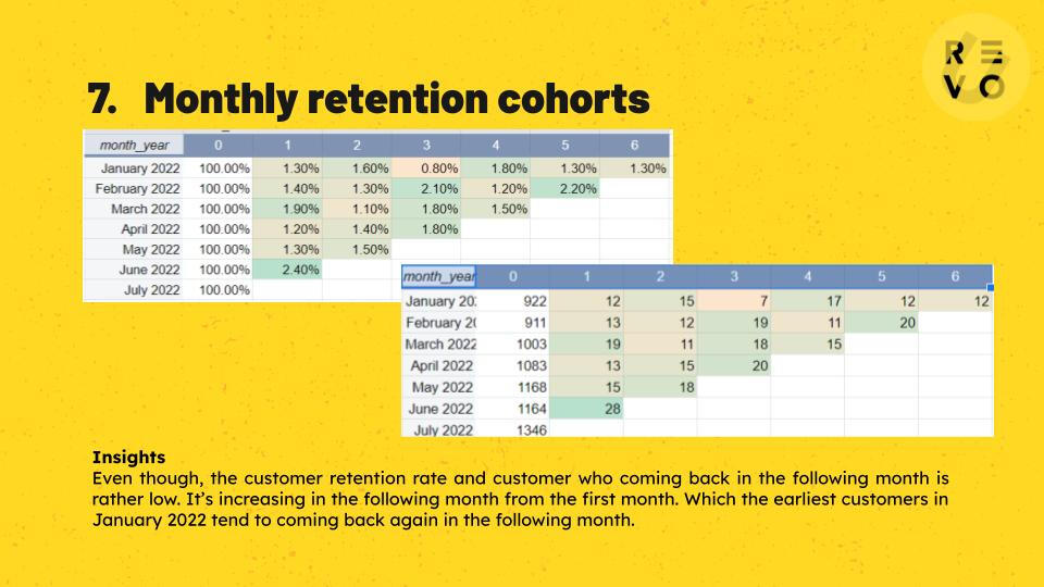 Even so, the customer retention rate and customers who come back in the following month is rather low. It’s increasing in the following month from the first month. The earliest customers in January 2022 tend to come back again in the following month.