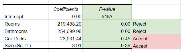 Using linear regression, we find that price = 0 + 219488 * rooms + 254699 * bathrooms + 28031 * car parks + 3 * size + 588317