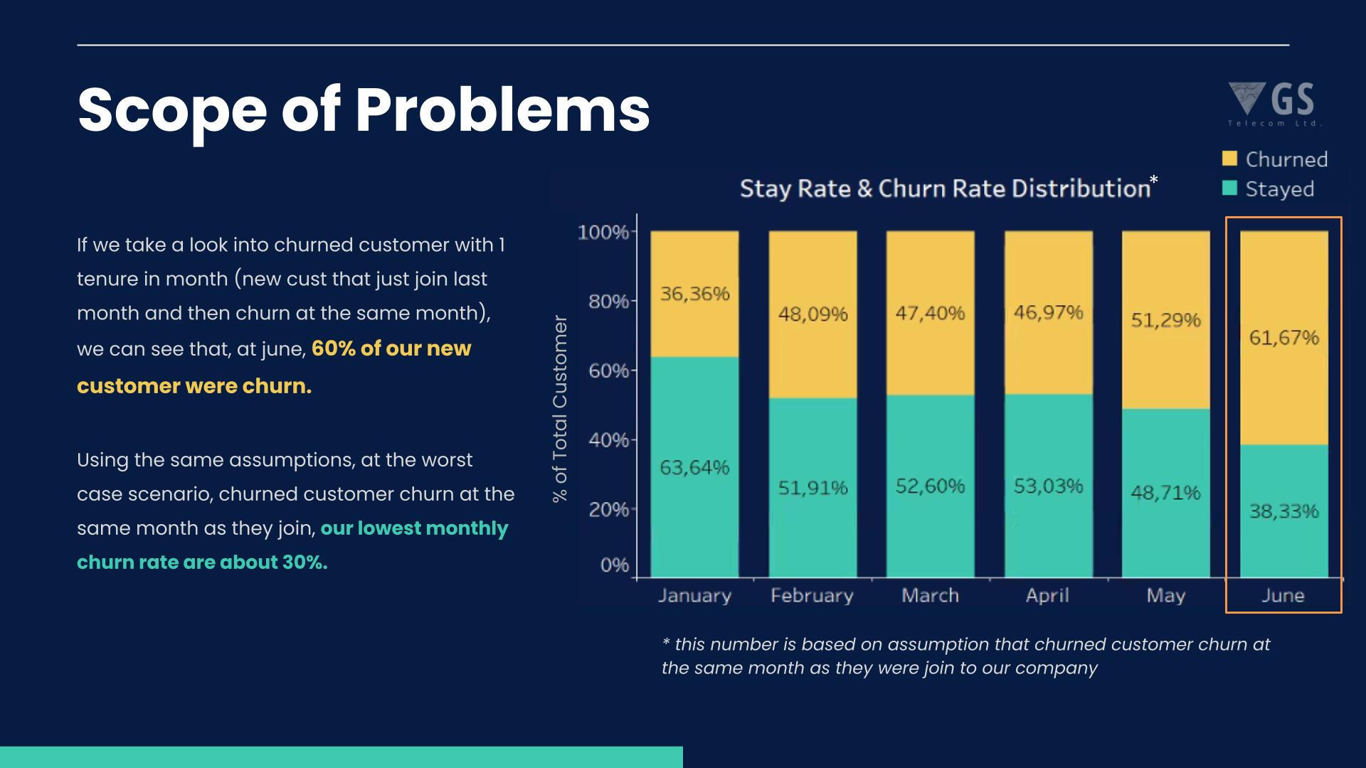 If we take a look into churned customers with 1 tenure in a month (new cust that just joined last month then churn at the same month), we can see that 60% of our new customers were churn in June 2022 meanwhile our lowest monthly churn rate is 30% in January 2022. So the objective was to reduce the customer churn rate back to 30% from 60% at Q4 of 2022.